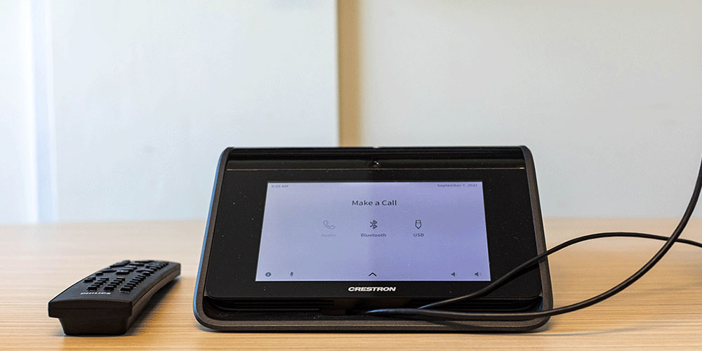 In the smaller meeting space, a Crestron Flex Tabletop system, Huddly IQ camera and 55" Philips display provide the tools necessary to support straightforward BYOD (Bring Your Own Device) video or in-room meetings. The simple HDMI and USB connectivity creating a quick and easy way to start and run sessions, while experiencing high-quality video and audio.